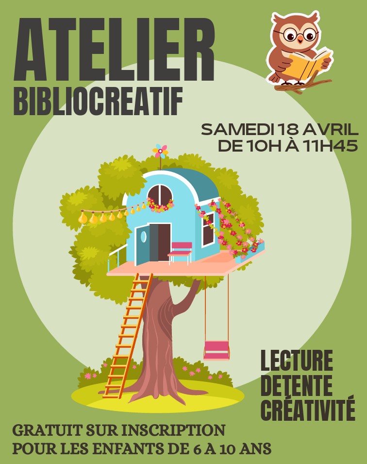 Notre bibliothèque organise un nouvel atelier bibliocréatif le samedi 18 avril, pour les enfants de 6 à 10 ans. Réservation obligatoire auprès des bénévoles de la bibliothèque.